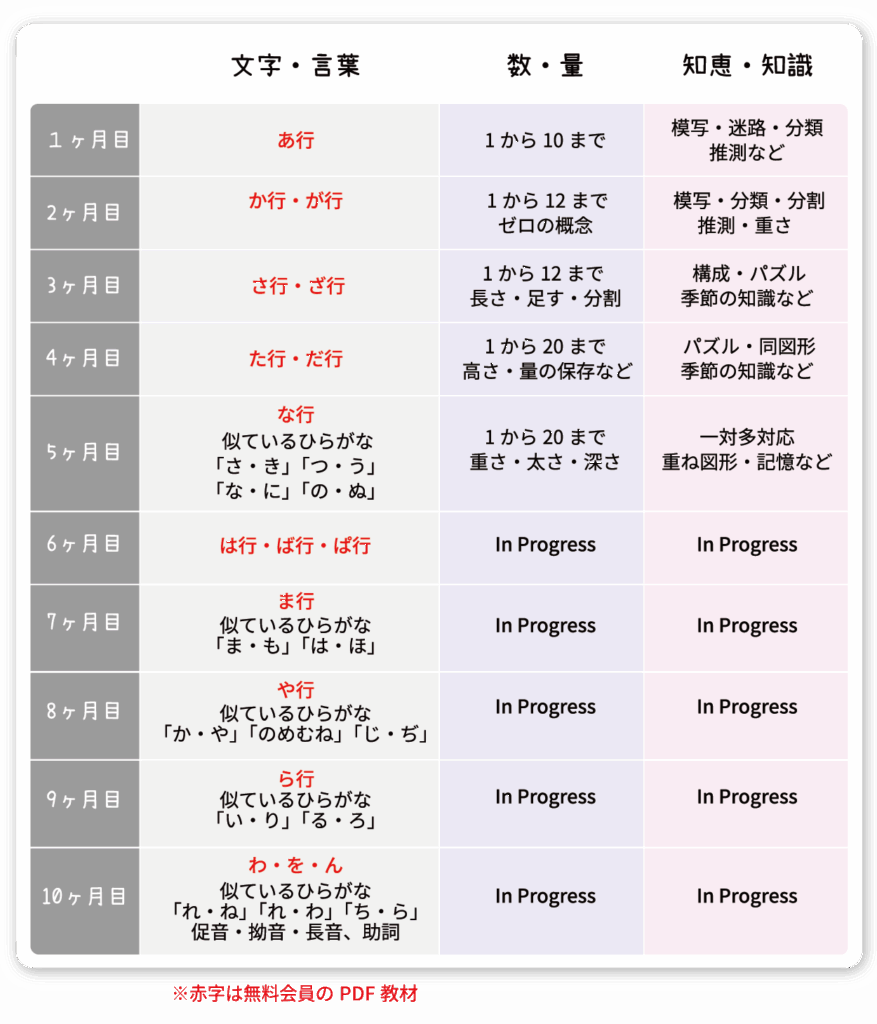 「ゼロ」の概念や、奇数・偶数の違いにも気づけるように工夫しています。数の並びの規則性(等差数列)は、先の学習にも繋げます。数量の理解では、量、重さ、高さ・低さ、長さを通して、理解力を深めます。